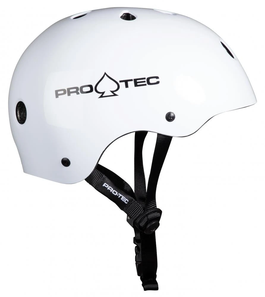 This is the Pro-Tec Classic Certified Helmet in Gloss White, a go to helmet suitable for skateboarding, rollerblading, scooter or BMX. The Classic Certified Helmet features Pro-Tec’s most durable outer high impact absorbing ABS shell, 11 open vents and an EPS foam liner with compression moulded padding.